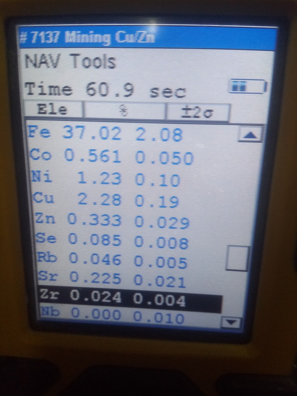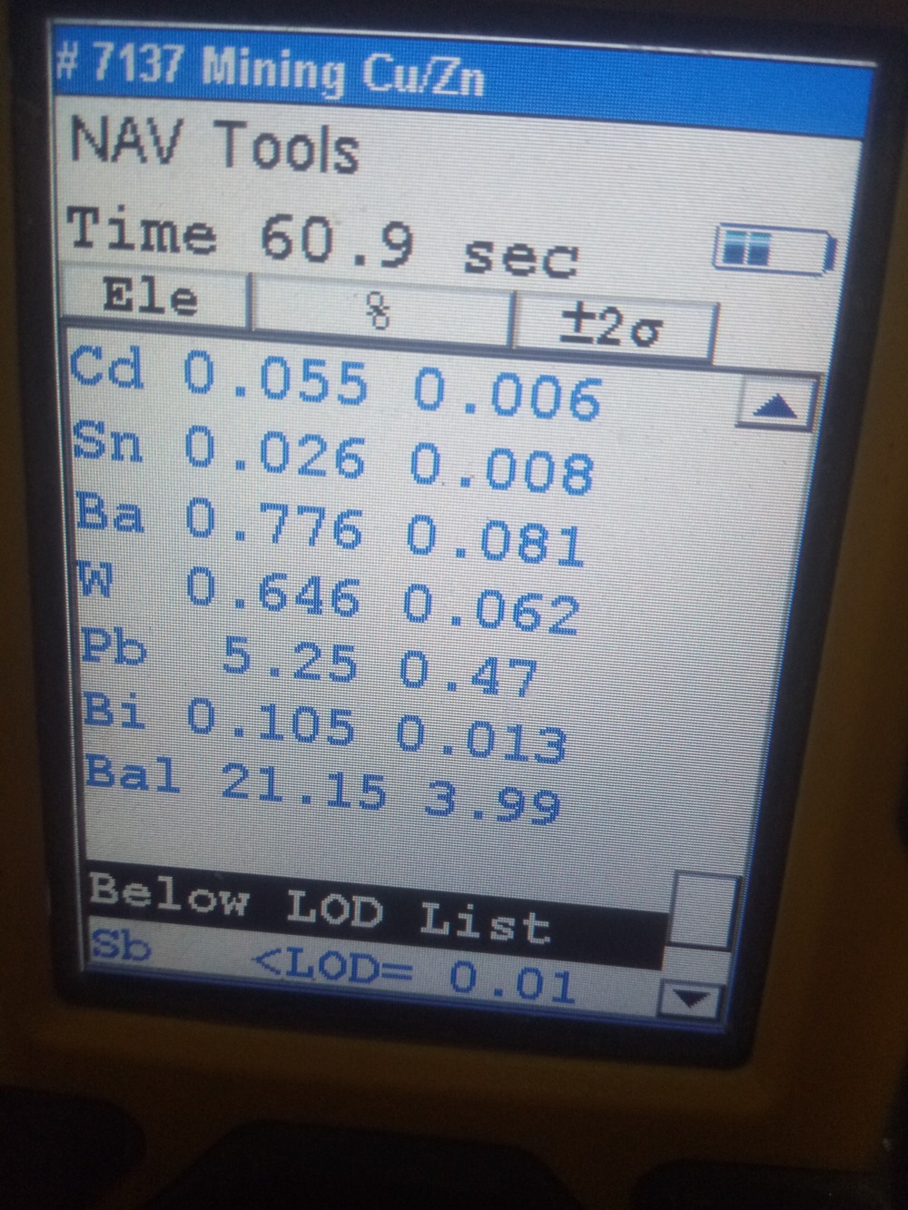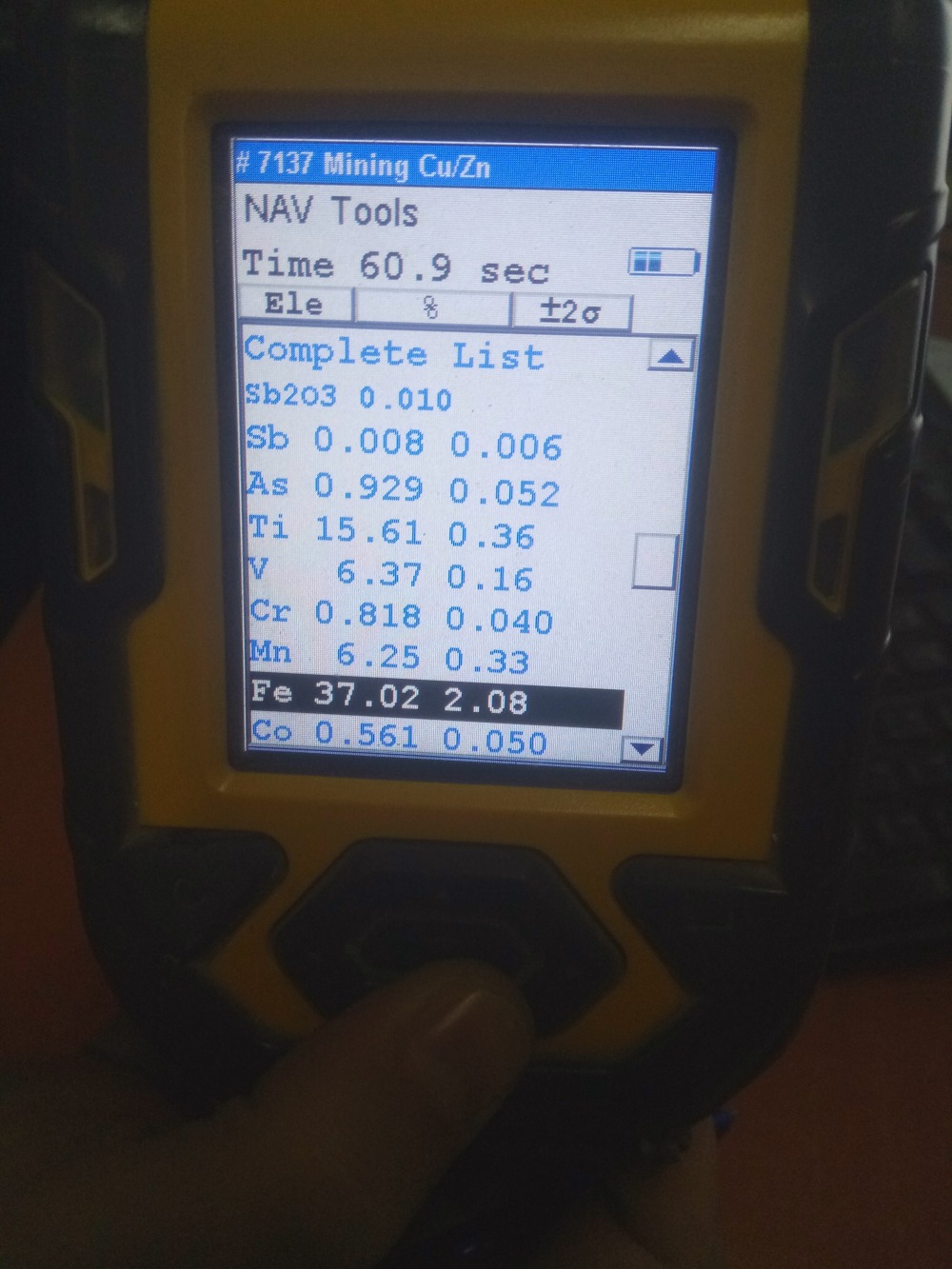 an Hitachi xrf reading pictures from the first vein sample lead with %43,5.